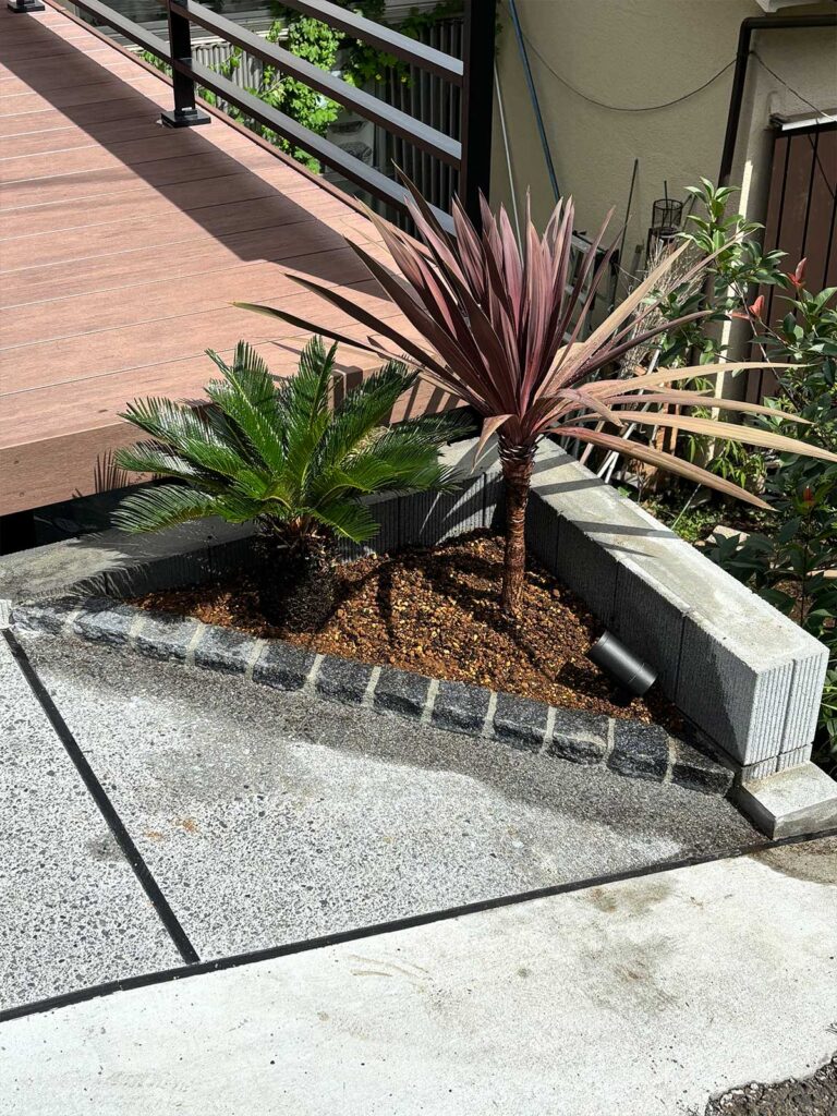 植物は手のかからないソテツとコルジリネ。